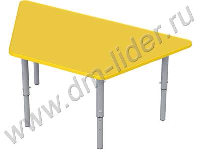 Стол в форме трапеции для занятий и приема пищи, на регулируемых ножках. Благодаря оригинальной форме, стол можно приставить к стене или скомбинировать с таким же по форме столом. Регулировка ножек позволит использовать стол на протяжении нескольких лет, так как он будет «расти» вместе с Вашим ребёнком. Используемые материалы: ламинированное ДСП толщиной 16 мм со стойким покрытием против воздействия воды и моющих, дезинфицирующих средств, защищенное противоударной кромкой ПВХ (Т16-2 мм).