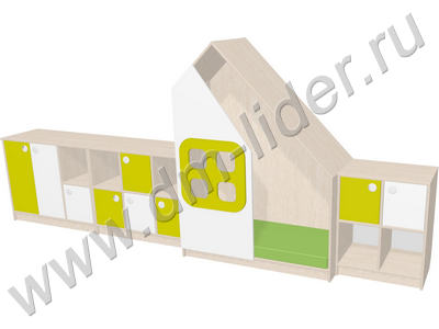 Габаритный размер: 3350х509х1504 мм. Набор состоит из четырех последовательных модулей. Конструкция первого модуля: каркас состоит из двух боковин, топа, дна и задней стенки. Внутреннее пространство модуля разделено вертикально на три секции, две из которых закрыты парой фасадов, третья секция разделена полкой пополам, нижняя ниша закрыта фасадом. Конструкция второго модуля: каркас состоит из двух боковин, топа, дна и задней стенки. Внутреннее пространство модуля разделено вертикально на три секции, каждая из которых разделена полкой пополам, нижние ниши закрыты фасадами и центральная верхняя ниша закрыта фасадом. Конструкция третьего модуля: каркас состоит из двух боковин, топа - домика, дна и задней стенки. Часть внутреннего пространства закрыта фигурной панелью, на которой предусмотрена декоративная накладка в форме окошка с противоударной кромкой ПВХ (Т16-2 мм). Дно комплектуется мягким матом. Конструкция четвертого модуля: каркас состоит из двух боковин, топа, дна и задней стенки. Внутреннее пространство модуля разделено вертикально на две секции, каждая из которых разделена полкой пополам, верхние ниши закрыты фасадами, а нижние открытые. Используемые материалы: ламинированное ДСП толщиной 16 мм со стойким покрытием против воздействия воды и моющих, дезинфицирующих средств. Все торцевые видимые и невидимые части ЛДСП обработаны кромкой ПВХ 0,4; 2 мм. Вид материала задней стенки: ДВП и ЛДСП. Тип ручки на фасадах врезная круглая, материал пластик.