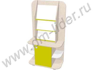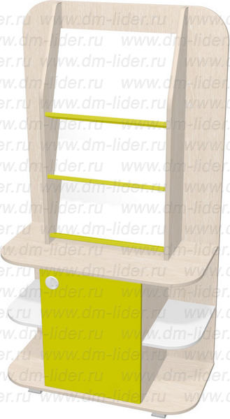 Габаритный размер: 800х400х1500 мм. Изделие представляет собой составную конструкцию из нижней части и надстройки. Внешний вид нижней части состоит из прямоугольного основания и топа со скругленными внешними углами, между которыми установлены вертикальные перегородки и горизонтальная полка. С внешних сторон перегородок крепятся скругленные полки. Пространство между перегородками закрыто распашным фасадом. Внешний вид надстройки состоит из фигурных боковин и