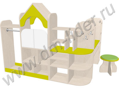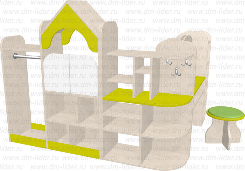 Габаритный размер: 1500/1230х304х1186/906мм. Зона состоит из четырех модулей, образующих угловую конструкцию, и табурета. Внешний вид первого модуля представляет собой вешалку для костюмов, состоит из двух боковин, дна и топа. Топ утоплен относительно боковин и может служить полкой. Внутреннее пространство комплектуется хромированной штангой. Одна из боковин комплектуется прямоугольным зеркальным панно и крючками. Пространство у дна ограничено с двух сторон прямоугольными бортами. Углы боковин скруглены. Внешний вид второго модуля состоит из двух боковин, дна, топа и задней стенки. Топ выполнен в форме угловой крыши. Крыша с обеих сторон декорируется вкладной фрезерованной панелью. Внутреннее пространство разделено горизонтальной полкой на две части. Верхняя часть закрывается парой фрезерованных фасадов с внешней стороны модуля. Фасады закрывают пространство только до начала крыши (угловая часть модуля открытая). Нижняя часть модуля разделена на четыре ниши. В нижней части предусмотрено наличие задней стенки. По нижнему краю модуля с внешней стороны предусмотрен борт. Внешний вид третьего модуля угловой, разделен радиусной столешницей на две части. Нижняя часть состоит из пяти ниш, две из которых угловые, разделенные горизонтально радиусной полочкой, имеют одинаковую высоту. Верхняя часть ограничена радиусным топом, разделена средником пополам. Одна половина состоит из четырех ниш для хранения, а вторая комплектуется тремя крючками. Внешний вид четвертого модуля состоит из двух блоков – стеллажа и столика. Стеллаж делится горизонтально прямоугольными полками на четыре сквозные ниши. Топ стеллажа утоплен относительно боковин. Подстолье второго блока комплектуется горизонтальной полкой, устанавливаемой во всю глубину изделия. По центру столешницы устанавливается фрезерованная панель, на которую, с внешней стороны, крепится круглое зеркало. Панель ограничена вертикальным средником, который соединяется с боковой стенкой тремя горизонтальными полочками. Внешний вид табурета: круглое мягкое сидение и четыре опорные фигурные ножки. Габаритный размер табурета: 300х300х300 мм. Используемые материалы: ламинированное ДСП толщиной 16 мм со стойким покрытием против воздействия воды и моющих, дезинфицирующих средств, защищенное кромкой ПВХ 0,4; 2 мм. Ножки и сиденье табурета и вырез для зеркала защищены противоударной кромкой ПВХ (Т16-2 мм).