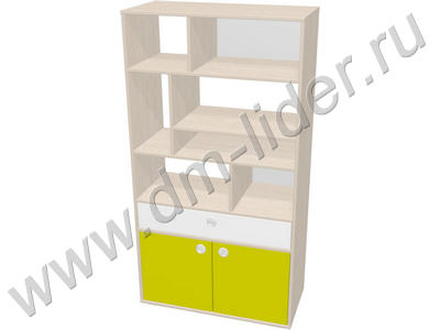 Габаритный размер: 850х400х1600 мм. Конструкция изделия состоит из двух боковин, дна, топа и задней стенки. Внутреннее пространство разделено на три функциональные части. В верхней части предусмотрены открытые ниши разной формы и размера в количестве 7 штук, две из которых оснащены задними стенками, остальные ниши – сквозные. Пространство второй части комплектуется выдвижным ящиком на шариковых направляющих. Нижняя часть закрыта парой распашных фасадов. Используемые материалы: ламинированное ДСП толщиной 16 мм со стойким покрытием против воздействия воды и моющих, дезинфицирующих средств, защищенное кромкой ПВХ 0,4; 2 мм. Тип материала дна ящика и задней стенки ДВП. Тип опор регулируемые, материал пластик. Тип ручки врезная круглая, материал пластик, материал пластик.