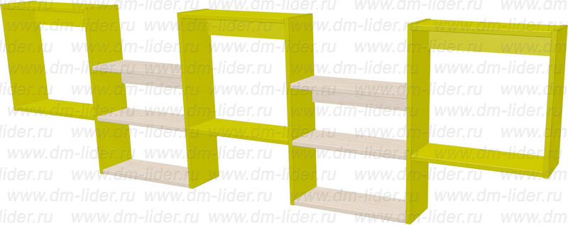Габаритный размер: 2031х152х600 мм. Полка настенная, открытая, прямая. Конструкция представляет собой пять ниш в форме кубов, соединенных смежными стенками, располагаясь в шахматном порядке. Кубы нижнего ряда разделены горизонтальной полкой пополам. Используемые материалы: ламинированное ДСП толщиной 16 мм со стойким покрытием против воздействия воды и моющих, дезинфицирующих средств, защищенное кромкой ПВХ 0,4; 2 мм.