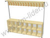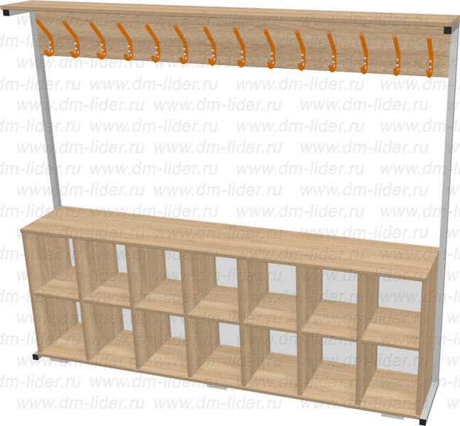 Односторонняя вешалка на металлическом каркасе на 14 мест предназначена для использования в гардеробных школ, детских учреждений, спортивных залов и других общественных помещений. Крючки позволяют сэкономить место и разместить большое кол-во одежды, открытые ячейки стеллажа предназначены для сухой обуви, рюкзаков, сумок и пр. Используемые материалы: ламинированное ДСП толщиной 16 мм со стойким покрытием против воздействия воды и моющих, дезинфицирующих средств, защищенное кромкой ПВХ.