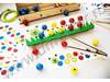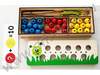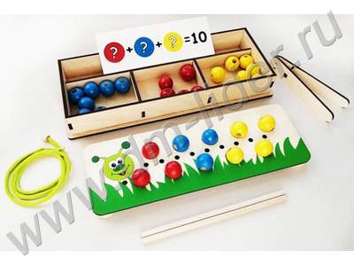 Игрушка состоит из поля с отверстиями под цветные шарики (10 красных, 10 синих, 10 жёлтых), двух деревянных палочек, шнурка и пинцета. В комплекте идут 16 игровых двухсторонних карточек: 8 карточек с заданиями собрать гусеницу, 8 карточек с заданиями на арифметические навыки, изучение цифр. Игровой набор рекомендован детям от 3 до 6 лет. Задача - расставить шарики согласно заданиям на карточках. Во время игры ребёнок активно задействует мелкую моторику и логическое мышление, познакомится с цветом, цифрами, арифметическим счетом до 10. Игра упакована в коробку, удобную для хранения.