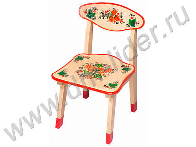Каркас стула изготовлен из древесины лиственных пород (береза) ГОСТ2695. Стул поставляется в собранном виде: сиденье прочно закрепленно к царгами; ножки передние столярные; спинка прочно закрепленная к задним ножкам, которые в свою очередь соединены на шиповое соединение с боковыми царгами. Спинка и сиденье выполнены из древесных материалов и имеют анатомическую форму. Неразъемные соединения на каркасе произведены при помощи шурупов и клея. Соединения деталей конструкции произведены на высококачественную фурнитуру и клеевые материалы ведущих мировых производителей. На спинке и сидении, с целью эстетического воспитания, предусмотрен художественный рисунок в стиле холодной хохломской росписи. На всю поверхность стула нанесено защитно-декоративное лакокрасочное покрытие. Стул можно использовать в игровой комнате, в музыкальном зале детского сада, в квартире или на даче.