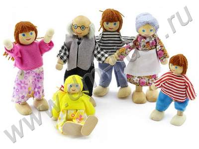 Небольшие деревянные куколки - это мечта многих детей! В наборе 6 кукол: мама, папа, мальчик, девочка, бабушка и дедушка. Основанием ручек и ножек служит проволочный каркас, тем самым их можно сгибать. Куклы выполнены из высококачественного натурального дерева и текстиля, одеты в яркие костюмы (не снимаются).