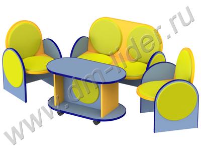 Полумягкая мебель отлично подходит для детских учреждений. Малыши могут собираться вместе, играть, общаться и просто читать книжки. Набор из дивана и кресел хорошо дополняет широкий журнальный столик на колесах. Изменяя цвета обивочного материала, Вы легко сможете сочетать набор мягкой мебели с другой мебелью в групповой комнате. Размеры: диван 88х53х70 см; кресло 47х53х70 см; стол 80х42х45 см.