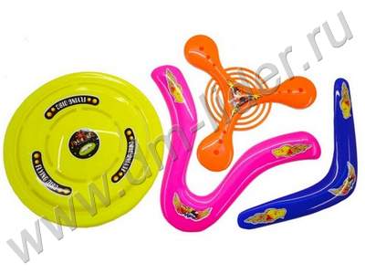 Комплект из пяти летающих фигур рекомендуется для развлечений всей семьей, для спортивных и игровых занятий в детских учреждениях на открытом воздухе. Фигуры развивают физические навыки игроков и позволяют активно проводить время. В комплекте два летающих диска и три бумеранга. Летающие диски с улучшенными аэродинамическими свойствами можно применять в классических фрисби-играх: "Фристайл", "Дог-фрисби", "Диск-гольф".